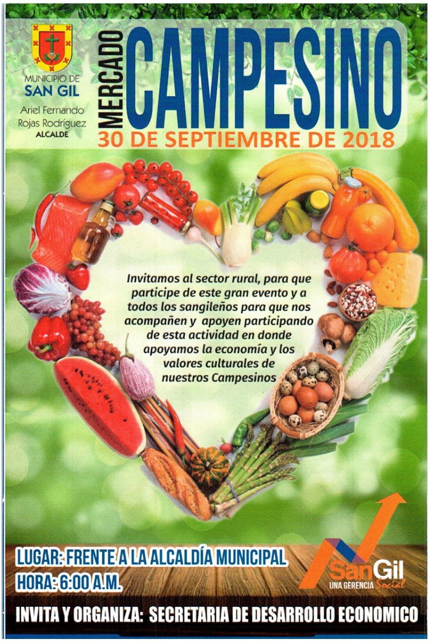 El secretario de Desarrollo Económico de San Gil, Carlos Millán Valderrama, está haciendo la invitación a toda la comunidad de la Perla del Fonce al mercado campesino que se llevará a cabo este domingo, 30 de septiembre, el cual contará con la participación de 200 productores agrícolas del municipio.